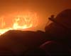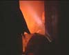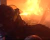 Firefighter studies fire burning, then extinguishes it, thermal layer